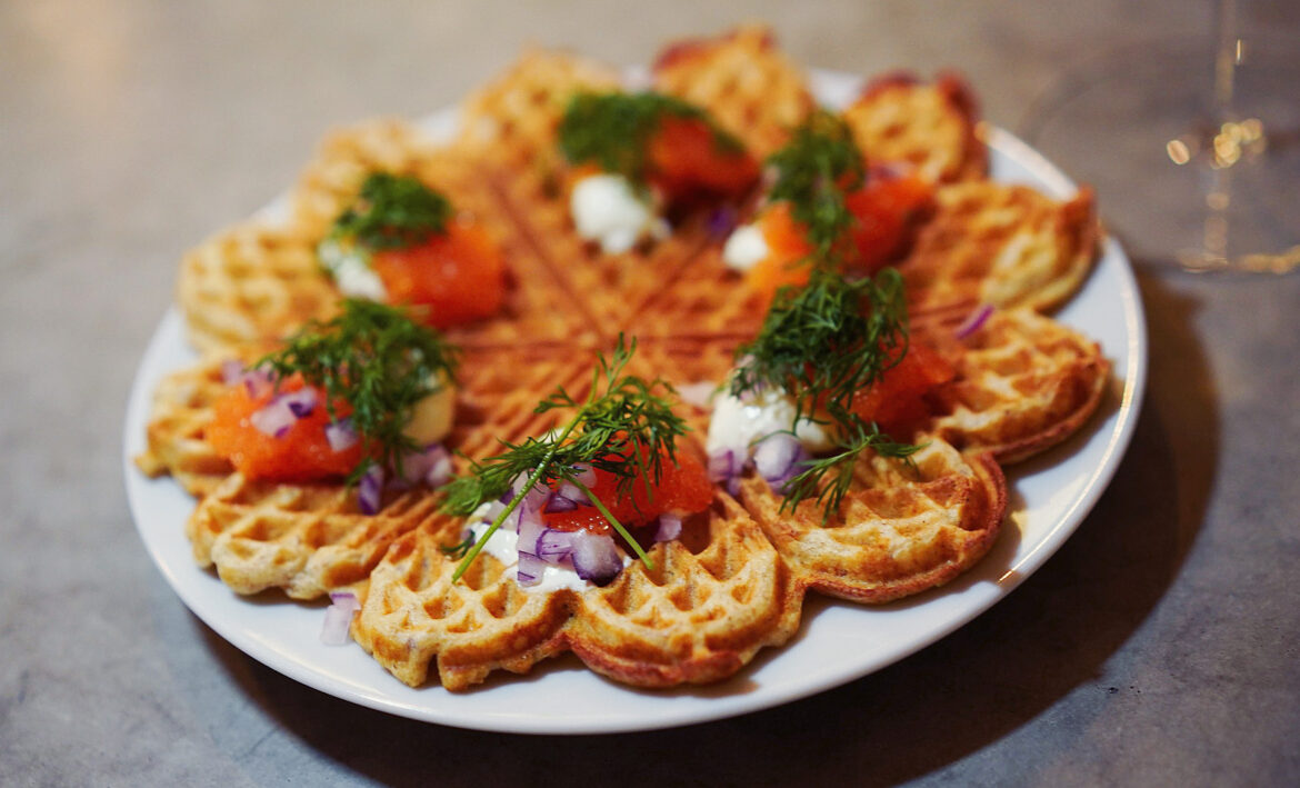 Dette er jo litt jålete gutter, og det var selvfølgelig gitt at vi skulle drikke Champagne. I glasset helte jeg årgangsboblene til Launois, og jeg bestemte meg for å lage vafler. Det naturlige valget når det snakkes forrett. Men jeg lagde de grove og serverte de med seterrømme, løyrom, rødløk og dill. Det ble knallbra, og kvelden utartet seg tilsvarende. Vi knertet en rekke særs tiltalende flasker med gjæret druesaft, vi spiste vafler med løyrom, klassisk juleribbe og avsluttet med pepperkaker og Stilton. De pratet om hvor dritt det er å være i forhold, og jeg raljerte om hvor episk det er å være singel og på tinder. Eller var det motsatt? Anywho. Lag vafler neste gang du skal ha noe snacks å starte kvelden med da. Kanskje til og med på julekvelden?